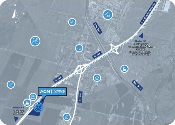 AGN Punto 38 es un proyecto Logístico Comercial, ubicado en el acceso Sur de la provincia sobre autopista de la ruta 38, a la altura de los Aguirre, que une el sur de la provincia con San Miguel de Tucumán y con todo el NOA y el NEA.